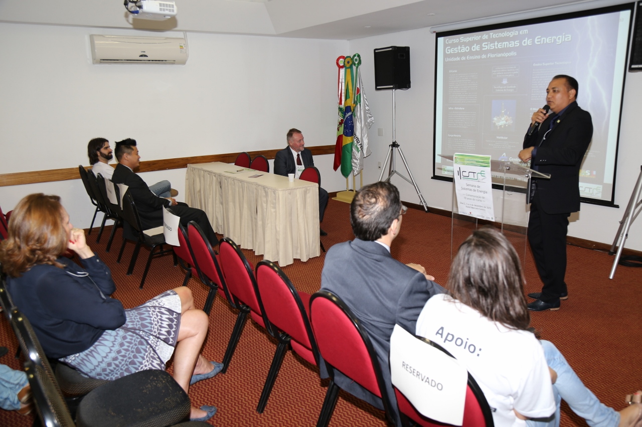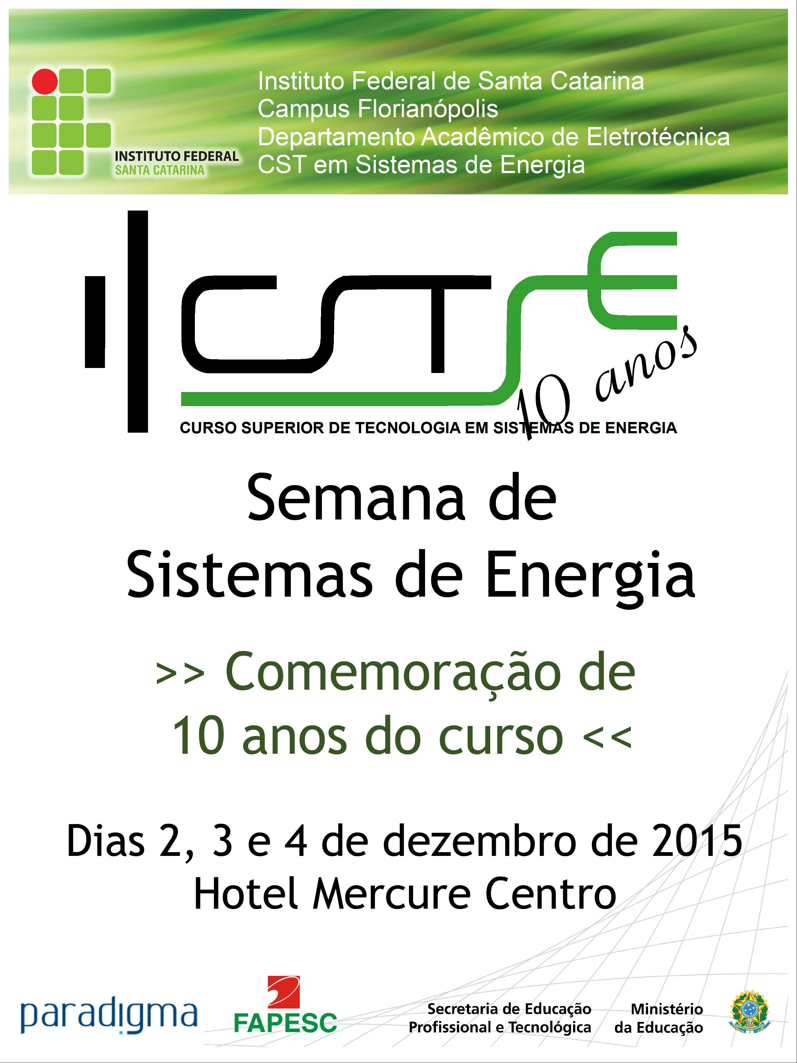 O objetivo desse trabalho é relatar a preparação, execução e avaliação do evento intitulado Semana de Sistemas de Energia realizado nos dias 02, 03 e 04 de dezembro de 2015, em comemoração aos dez anos do Curso Superior de Tecnologia em Sistemas de Energia (CSTSE) do Instituto Federal de Educação, Ciência e Tecnologia de Santa Catarina (IFSC). O evento contou com diversos participantes de diferentes áreas do Setor Elétrico Brasileiro, como por exemplo, representantes da Agência Reguladora de Energia Elétrica (ANEEL), Associação Brasileira dos Investidores em Autoprodução de Energia (ABIAPE), Operador Nacional do Sistema Elétrico (ONS), Tractebel Energia, COMPASS Comercializadora de Energia além de egressos do curso que contaram suas experiências profissionais e relataram sobre o período em que eram estudantes do curso.