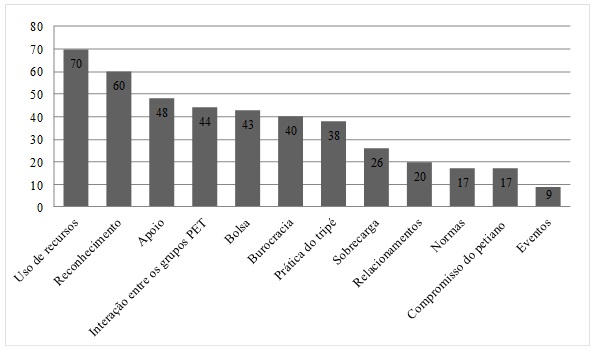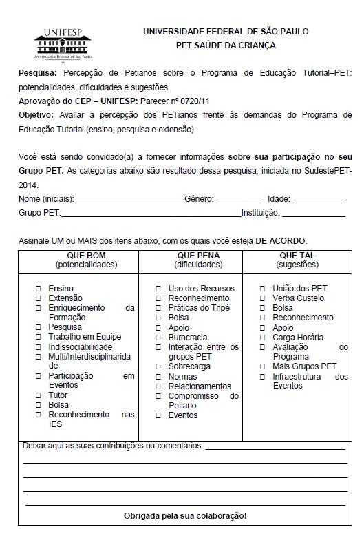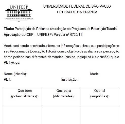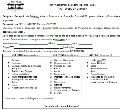 Frente à ampla gama de desafios refletidos na implantação, manutenção, sustentabilidade do programa junto com inconstância de liberação e normatização para uso da verba de custeio, além das inúmeras mudanças nas políticas educacionais e no sistema de ingresso e permanência de estudantes nas universidades, torna-se relevante avaliar as influências do Programa de Educação Tutorial na formação profissional através da ótica dos integrantes acadêmicos do PET. Diante da escassez de pesquisas sobre o assunto, bolsistas do PET Saúde da Criança consideram pertinente a possibilidade de conhecer as percepções dos acadêmicos, possibilitando que exponham suas opiniões acerca das potencialidades, fragilidades e sugestões para o Programa, no sentido de possibilitar seu aprimoramento.