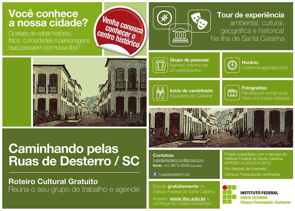 Para atender a demanda da atividade turística e propiciar qualidade no atendimento nos serviços, o projeto Caminhando pelas Ruas de Desterro - SC teve como objetivo oferecer a atividade de educação patrimonial junto a trabalhadores da cidade através de caminhadas culturais gratuitas no Centro Histórico de Florianópolis, com a intenção de comparar e promover uma interação dialógica dos participantes com a cidade. Por ser um projeto de extensão vinculado ao ensino, teve como um dos seus objetivos; o aprimoramento da prática profissional das discentes do Curso Técnico em Guia de Turismo, ofertado pelo Campus Florianópolis Continente - IFSC. O delineamento metodológico se caracterizou como qualitativa, aplicada descritiva, bibliográfica e a aplicação de um opinário. Dentre os resultados, foi constatado a falta de tempo e disponibilidade do público-alvo em participar da caminhada.