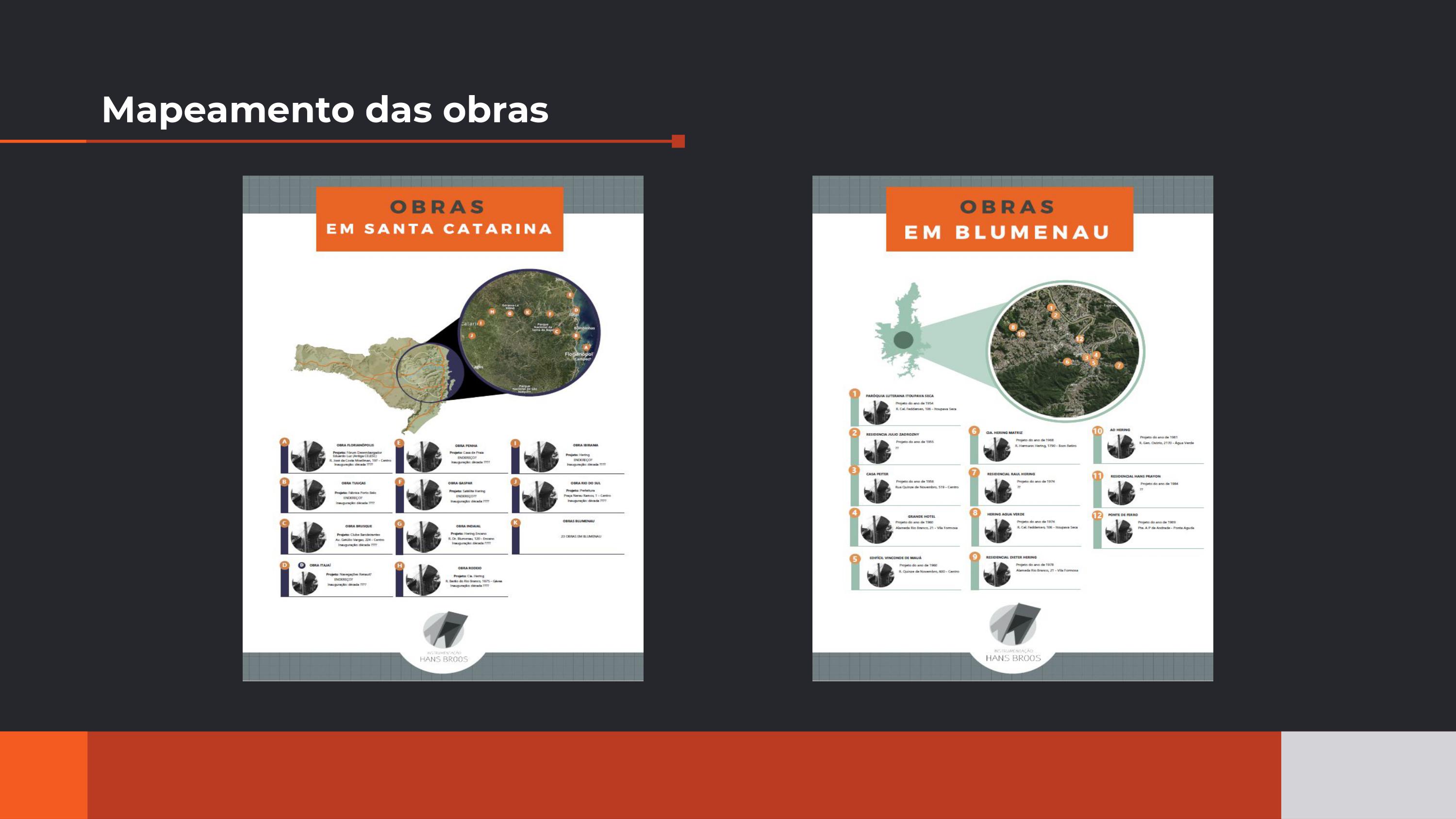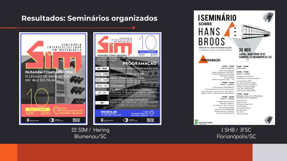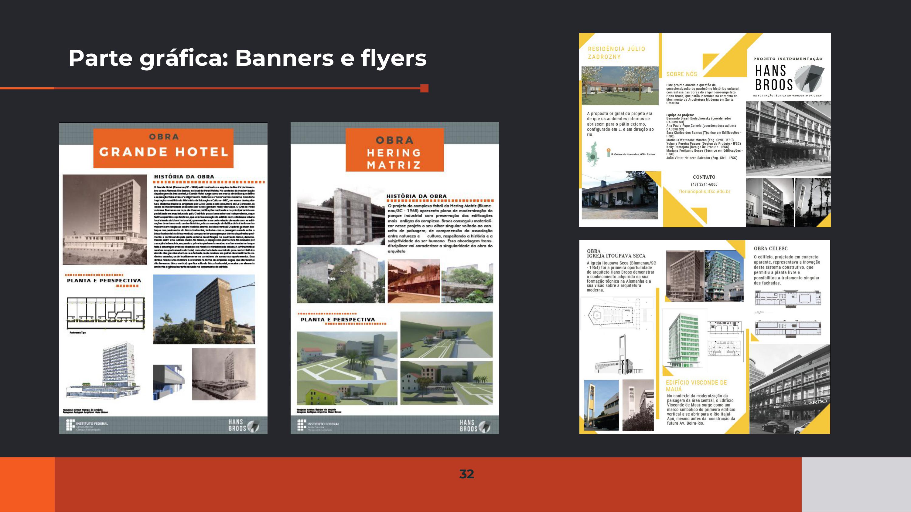 O projeto propôs a articulação da pesquisa e extensão ao ensino, utilizando as obras do arquiteto Hans Broos em Santa Catarina que constam no processo de tombamento em instrução no IPHAN, que foi a instituição demandante externa. A própria comunidade denunciou algumas demolições, que serviram como justificativa para a realização da atividade de extensão. Foi possível inserir a discussão sobre a valorização patrimonial no ensino, com uma equipe multidisciplinar de bolsistas como protagonistas dessas atividades, attavés das atividades de ensino e da apresentação dos resultados do projeto para o público interno e externo ao IFSC, como as instituições de patrimônio (IPHAN, FCC, CAU) e demais universidades que pesquisam no campo acadêmico (UFSC, FURB, UNIDAVI, UNISOCIESC).